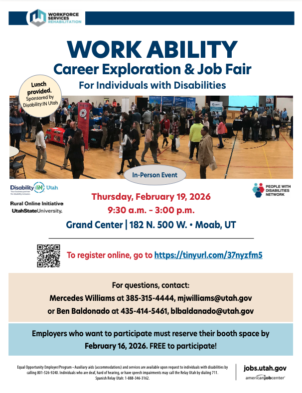 For individuals with disabilities seeking employment: the Work-Ability Career Exploration & Job Fair in Moab, UT is set to be held on February 19, 2026!
